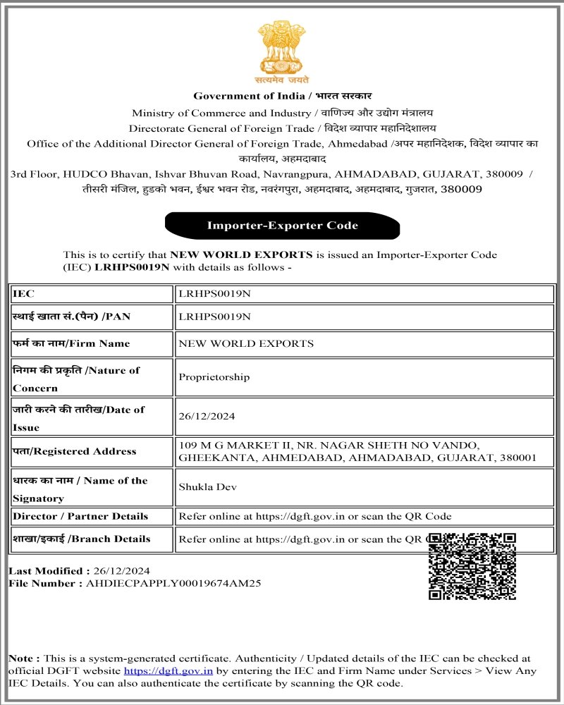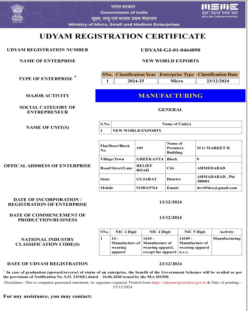 The D2BINDIA platform is legally owned and managed by New World Exports, a fully compliant Indian business entity. New World Exports is an ISO 9001:2015 certified organization and is registered under MSME (Udyam). The company also holds a valid IEC (Import Export Code) and GST registration, ensuring transparency, regulatory compliance, and credibility in all business transactions conducted through the platform.