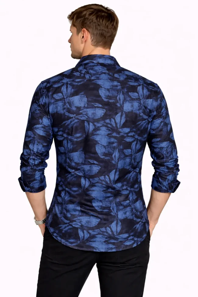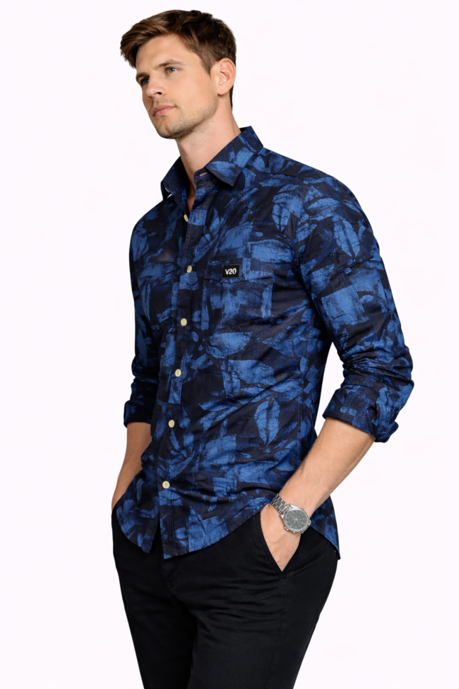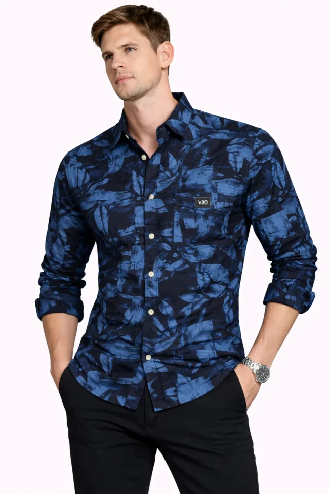 Upgrade your everyday style with this premium Navy Blue & Black Leaf Printed Shirt from V-20. Designed for modern men, this full sleeve shirt blends comfort, bold design, and smart casual elegance. Available in sizes S to XXL.