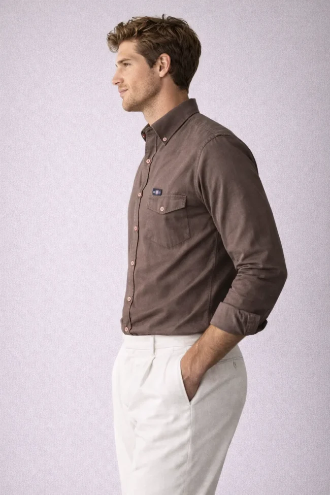 Upgrade your wardrobe with this premium dark taupe brown full sleeve shirt featuring double flap chest pockets and a modern slim fit design. Perfect for office and evening wear.
