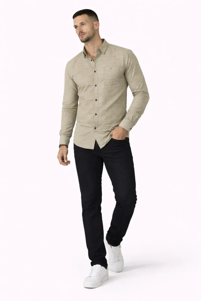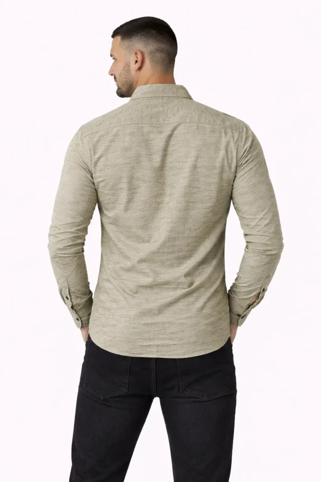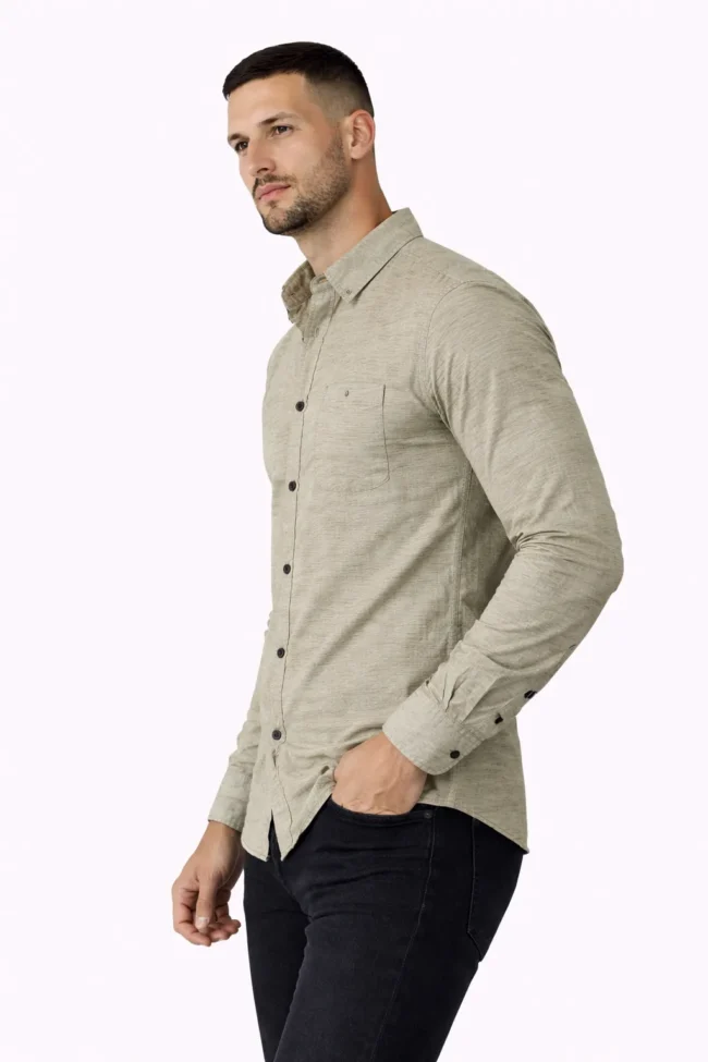 Premium Light Olive Khaki textured shirt crafted in breathable cotton blend fabric. Regular fit full sleeve design with chest pocket – perfect for office, casual outings & smart styling. Available from M to XXL.