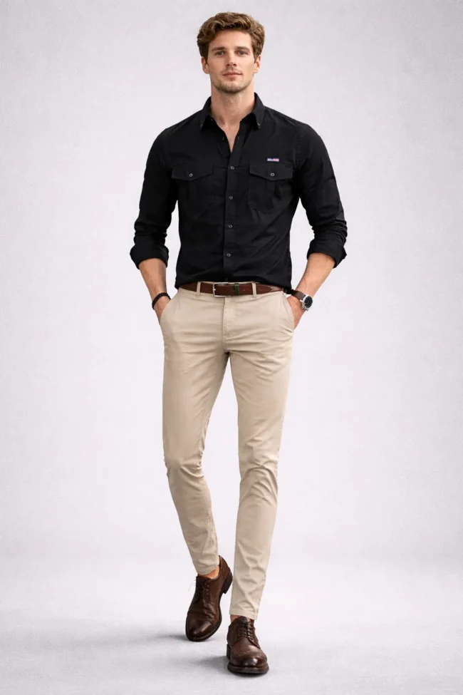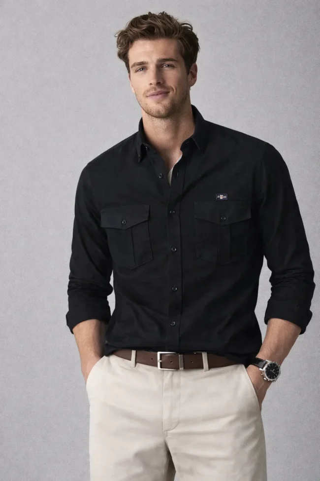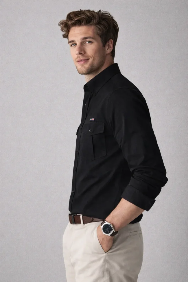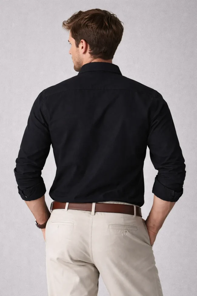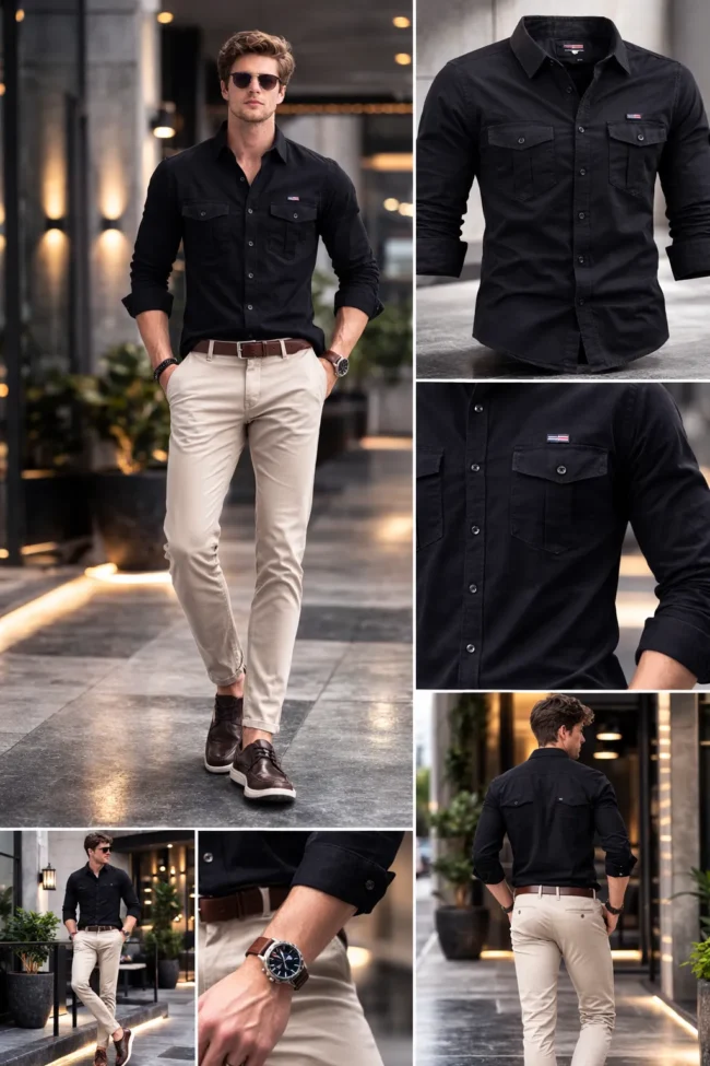 Whether paired with chinos, formal trousers, or denim, this black shirt delivers a bold and premium look.