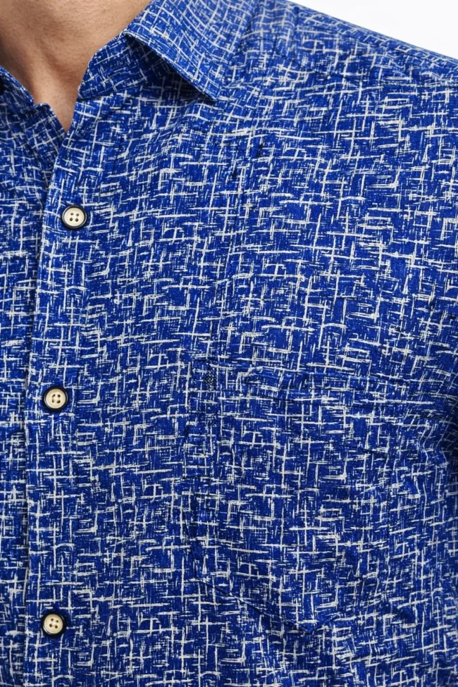 The rich royal blue base with fine abstract textured print gives it a luxury designer look, making it ideal for office meetings, casual brunches, evening outings, and special occasions. The full sleeves, classic collar, and button-down closure add a sharp, sophisticated finish.