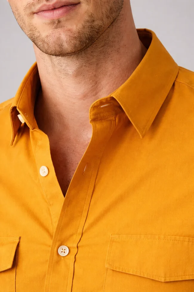 Upgrade your wardrobe with this premium mustard yellow full sleeve shirt featuring double flap pockets and a modern slim fit design. Perfect for office, casual outings, and party wear. Available Sizes S to XL