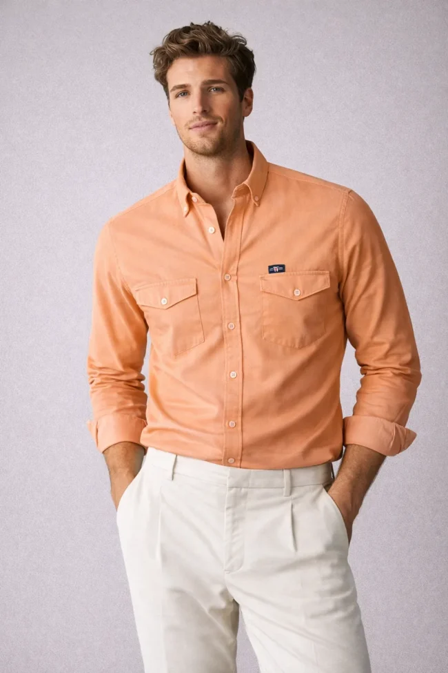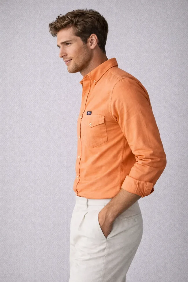 Make a bold and confident style statement with this Rust Orange Full Sleeve Men’s Shirt. Designed with stylish double flap chest pockets and a tailored slim fit structure, this shirt blends modern fashion with everyday comfort.